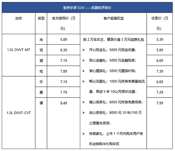 6月22日,凱翼炫界迎來(lái)上市。新車提供1.5L DVVT-MT、1.5L DVVT-CVT兩種動(dòng)力組合,共計(jì)7款車型,售價(jià)為5.39萬(wàn)元——7.99萬(wàn)元。