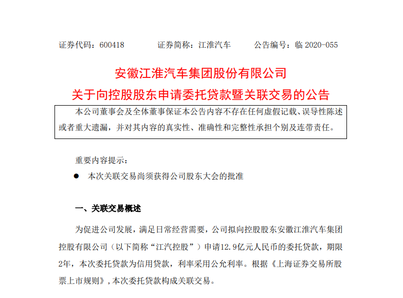 同日,江淮汽車還發(fā)布了向控股股東申請委托貸款的公告。公告顯示,為促進(jìn)公司發(fā)展,滿足日常經(jīng)營需要,公司擬向控股股東安徽江淮汽車集團(tuán)控股有限公司申請12.9億元人民幣的委托貸款,期限2年。
