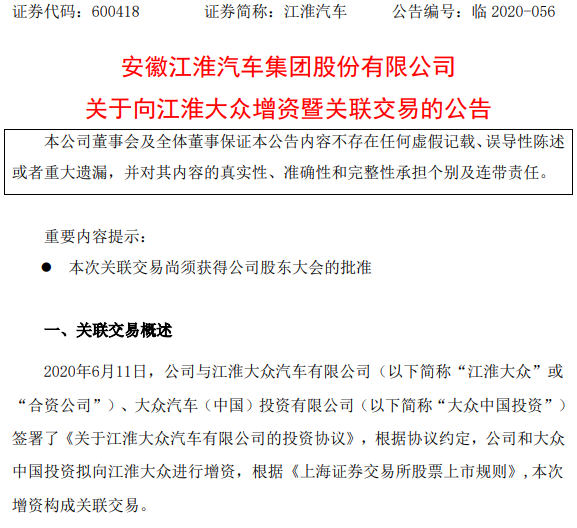 江淮汽車方面表示,“本次增資系公司和大眾中國投資戰(zhàn)略合作中的重要環(huán)節(jié),本次增資有利于推進(jìn)公司和大眾中國投資的戰(zhàn)略合作,有利于促進(jìn)合資公司的發(fā)展。”
