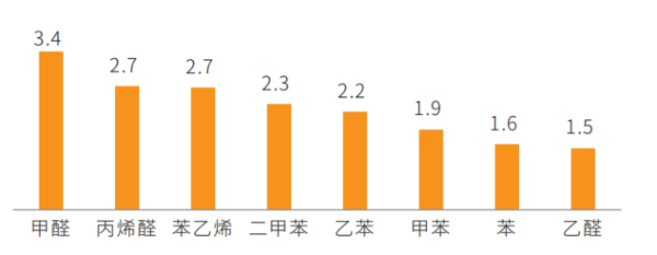 高溫模式下的揮發(fā)性有機物測評結(jié)果不如人意,濃度平均為常溫下的2倍。甲醛、乙醛、二甲苯和苯乙烯分別為常溫模式的3.8倍、1.5倍、2.3倍和2.7倍。由此可見,消費者“溫度越高,車里味道越大”的樸素感知與測試結(jié)果相符,高溫下的車內(nèi)污染問題亟待解決。?