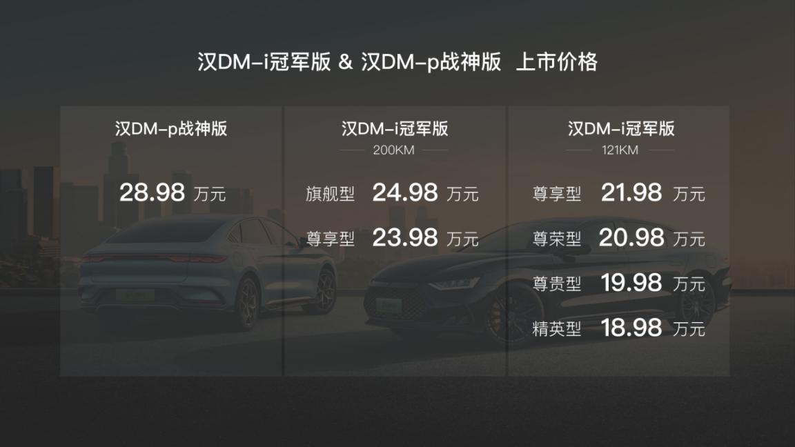 此次,產(chǎn)品實(shí)力全面進(jìn)階的漢DM系列兩款車(chē)型中,漢DM-i冠軍版的價(jià)格區(qū)間為18.98萬(wàn)元~24.98萬(wàn)元,漢DM-p戰(zhàn)神版的價(jià)格為28.98萬(wàn)元。此外,全新漢DM系列還為用戶準(zhǔn)備了5大智聯(lián)在線服務(wù)、5大專(zhuān)屬貴賓服務(wù)、2大無(wú)憂購(gòu)車(chē)政策等多重購(gòu)車(chē)禮遇。
