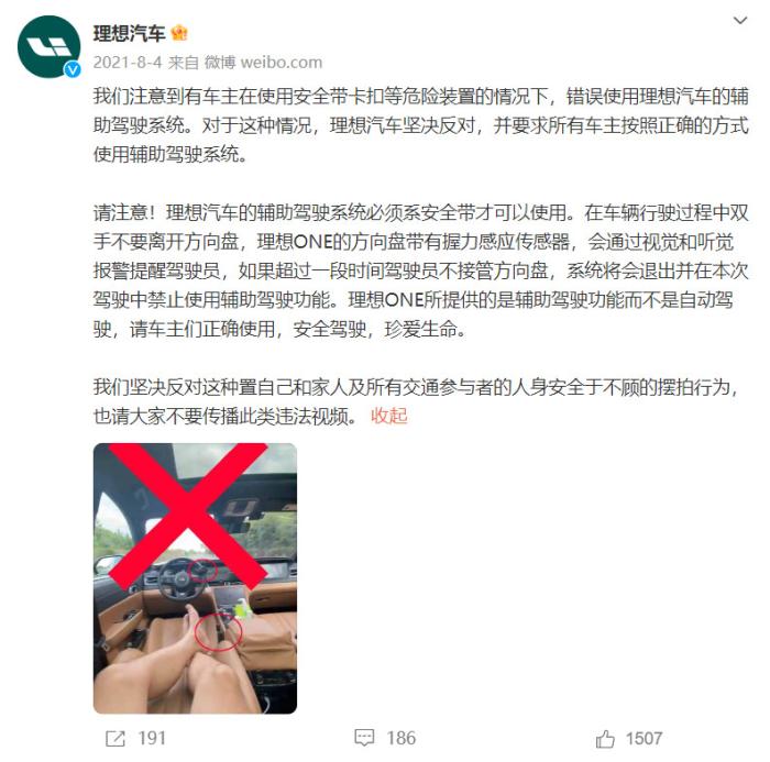 針對上述行為,理想汽車在2021年曾通過微博回應(yīng)稱,“理想汽車的輔助駕駛系統(tǒng)必須系安全帶才可以使用。在車輛行駛過程中雙手不要離開方向盤,理想ONE的方向盤帶有握力感應(yīng)傳感器,會通過視覺和聽覺報(bào)警提醒駕駛員,如果超過一段時(shí)間駕駛員不接管方向盤,系統(tǒng)將會退出并在本次駕駛中禁止使用輔助駕駛功能?!?/p>