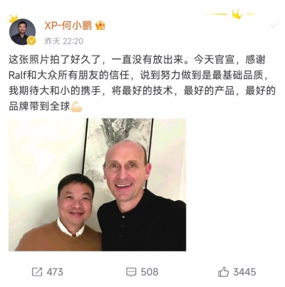 7月26日晚,小鵬汽車董事長兼首席執(zhí)行官何小鵬發(fā)布微博放出了他和貝瑞德(Ralf?Brandstaetter)的合影。其在微博稱:“這張照片拍了好久了,一直沒有放出來。今天官宣,感謝Ralf和大眾所有朋友的信任,說到努力做到是最基礎(chǔ)品質(zhì),我期待大和小的攜手,將最好的技術(shù)、最好的產(chǎn)品、最好的品牌帶到全球?!?/p>