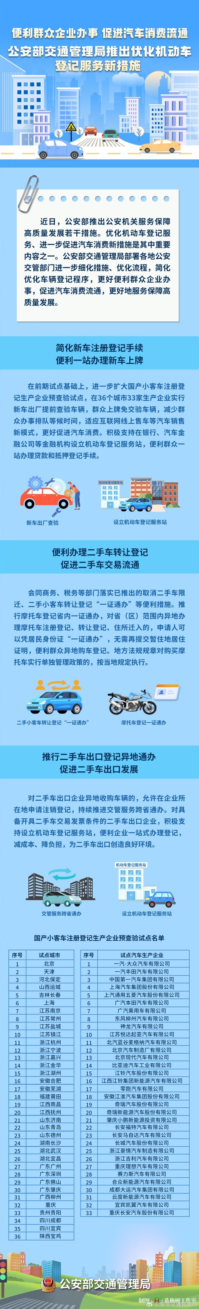 中新經(jīng)緯8月14日電 公安部交通管理局官方微博14日消息, 近日,公安部推出公安機(jī)關(guān)服務(wù)保障高質(zhì)量發(fā)展若干措施。優(yōu)化機(jī)動車登記服務(wù)、進(jìn)一步促進(jìn)汽車消費(fèi)新措施是其中重要內(nèi)容之一。 公安部交通管理局部署各地公安交管部門進(jìn)一步細(xì)化措施、優(yōu)化流程,簡化優(yōu)化車輛登記程序,更好便利群眾企業(yè)辦事,促進(jìn)汽車消費(fèi)流通,更好地服務(wù)保障高質(zhì)量發(fā)展。 簡化新車注冊登記手續(xù),便利一站辦理新車上牌。在前期試點(diǎn)基礎(chǔ)上,進(jìn)一步擴(kuò)大國產(chǎn)小客車注冊登記生產(chǎn)企業(yè)預(yù)查驗(yàn)試點(diǎn),在36個(gè)城市33家生產(chǎn)企業(yè)實(shí)行新車出廠提前查驗(yàn)車輛,群眾上牌免交驗(yàn)車輛,減少群眾辦事排隊(duì)等候時(shí)間,適應(yīng)互聯(lián)網(wǎng)線上售車等汽車銷售新模式,更好促進(jìn)汽車消費(fèi)。積極支持在銀行、汽車金融公司等金融機(jī)構(gòu)設(shè)立機(jī)動車登記服務(wù)站,便利群眾一站辦理貸款和抵押登記手續(xù)。 便利辦理二手車轉(zhuǎn)讓登記,促進(jìn)二手車交易流通。會同商務(wù)、稅務(wù)等部門落實(shí)已推出的取消二手車限遷、二手小客車轉(zhuǎn)讓登記“一證通辦”等便利措施。推行摩托車登記省內(nèi)一證通辦,對省(區(qū))范圍內(nèi)異地辦理摩托車注冊登記、轉(zhuǎn)讓登記、住所遷入的,申請人可以憑居民身份證“一證通辦”,無需再提交暫住地居住證明,便利群眾異地購車登記。地方法規(guī)規(guī)章對購買摩托車實(shí)行單獨(dú)管理政策的,按當(dāng)?shù)匾?guī)定執(zhí)行。 推行二手車出口登記異地通辦,促進(jìn)二手車出口發(fā)展。對二手車出口企業(yè)異地收購車輛的,允許在企業(yè)所在地申請注銷登記,持續(xù)推進(jìn)交管服務(wù)跨省通辦。對具備開具二手車交易發(fā)票條件的二手車出口企業(yè),積極支持設(shè)立機(jī)動車登記服務(wù)站,便利企業(yè)一站式辦理登記,減成本、降負(fù)擔(dān),為二手車出口創(chuàng)造良好環(huán)境。