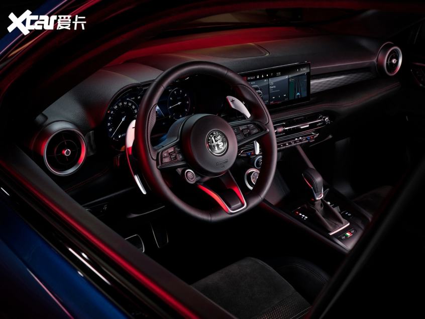 內(nèi)飾同樣延續(xù)了阿爾法·羅密歐家族的經(jīng)典設(shè)計(jì),啟動按鈕設(shè)計(jì)在方向盤上,懸浮式中控屏尺寸為10.25英寸,并支持無線CarPlay和百度CarLife功能。