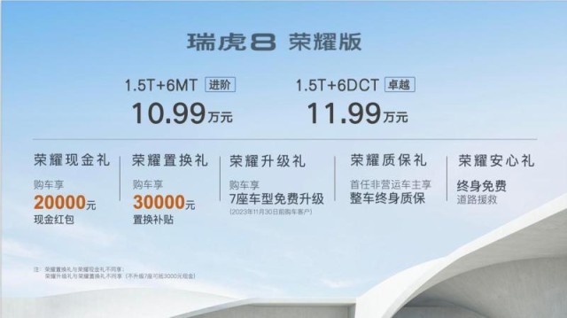 此外,瑞虎8榮耀版還為購車用戶帶來了5重購車禮遇,包括榮耀現(xiàn)金禮:購車即享20000元現(xiàn)金紅包、榮耀置換禮:購車即享30000元置換補(bǔ)貼(本品/他品同享)、榮耀升級(jí)禮:購車可享7座車型免費(fèi)升級(jí)(2023年11月30日前購車客戶)、榮耀質(zhì)保禮:首任非營運(yùn)車主享整車終身質(zhì)保、榮耀安心禮:終身免費(fèi)道路救援。(注:榮耀置換禮與榮耀現(xiàn)金禮不同享;榮耀升級(jí)禮與榮耀置換禮不同享;不升級(jí)7座可抵3000元現(xiàn)金。)