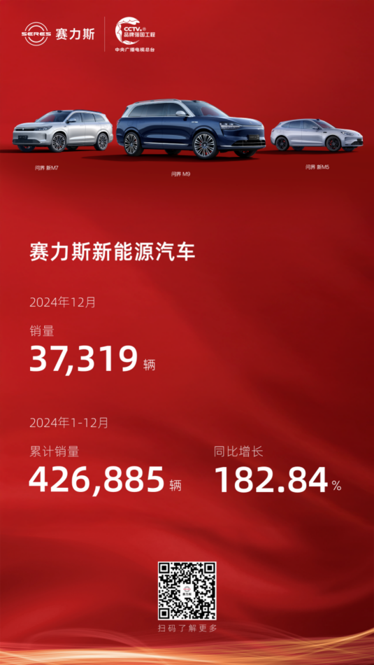 2025年1月1日,賽力斯發(fā)布2024年12月產(chǎn)銷快報。數(shù)據(jù)顯示,賽力斯12月新能源汽車銷量達37319輛;1-12月新能源汽車累計銷量達426885輛,同比增長182.84%。