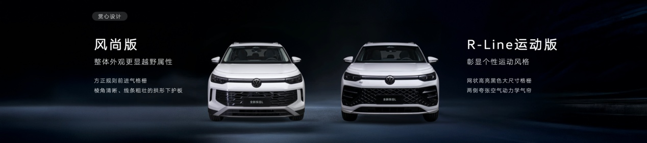 外觀(guān)造型上,為滿(mǎn)足當(dāng)下用戶(hù)多元化的審美需求,全新探岳L提供兩種前臉設(shè)計(jì)。其中,風(fēng)尚版車(chē)型的前臉?lè)秸乙?guī)則的進(jìn)氣格柵,輔以棱角清晰、線(xiàn)條粗壯的拱形下護(hù)板,整體外觀(guān)更顯越野屬性。相比之下,R-Line運(yùn)動(dòng)版則采用了品牌標(biāo)志性的網(wǎng)狀、高亮黑、大尺寸格柵,與兩側(cè)夸張的空氣動(dòng)力學(xué)氣簾相得益彰,賦予車(chē)輛更凌厲氣質(zhì),充分彰顯個(gè)性運(yùn)動(dòng)風(fēng)格。