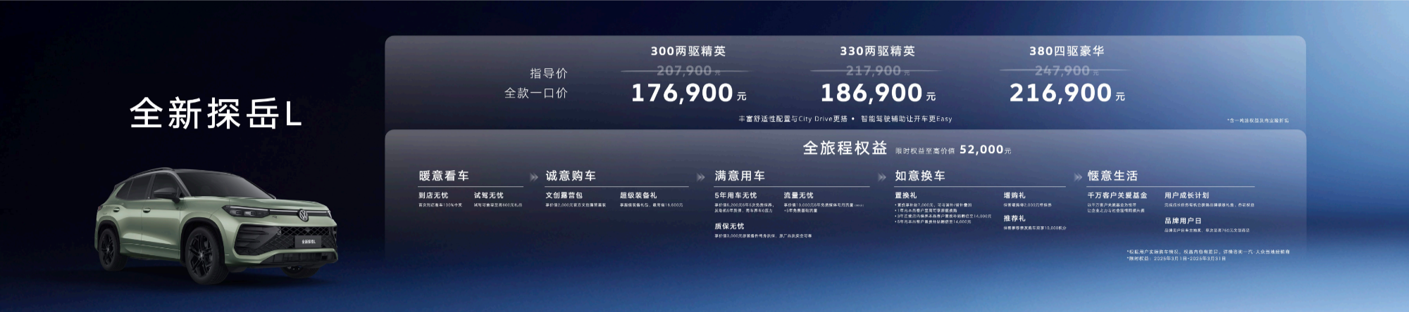3月1日,一汽-大眾全新探岳L在五岳之首泰山震撼上市,新車(chē)共推出300TSI、330TSI、380TSI三種動(dòng)力配置共3種車(chē)型,官方指導(dǎo)價(jià)20.79萬(wàn)元起,可選裝舒適性配置豐富的City包和駕駛輔助功能Easy包?,F(xiàn)在購(gòu)買(mǎi)全新探岳L,還將享受17.69萬(wàn)元起的全款一口價(jià)。