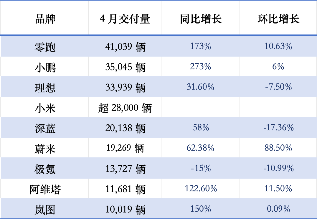 盡管行業(yè)淘汰賽加速,但多數(shù)新勢力品牌仍保持強勁增長勢頭。4月零跑、小鵬、嵐圖、阿維塔等都實現(xiàn)了翻倍增長,單品牌月交付量超2萬輛的品牌達(dá)到了5個,去年同期只有兩個品牌月交付量超2萬輛。