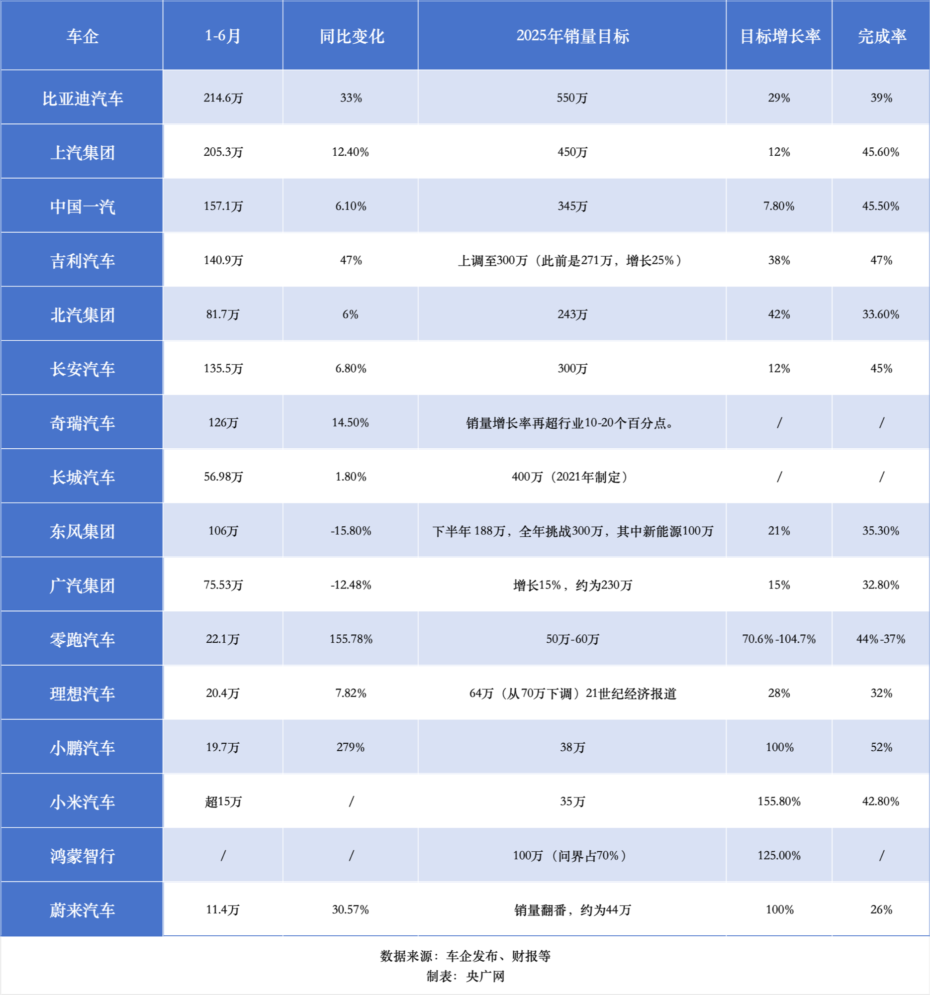 然而從年度銷量目標(biāo)完成率來看,據(jù)央廣網(wǎng)不完全統(tǒng)計(jì),僅小鵬汽車完成率超50%(其中吉利汽車因上調(diào)目標(biāo)導(dǎo)致不及50%),整體來看,完成率在30%-40%之間的有5家,低于30%的有1家,超過40%的有7家。