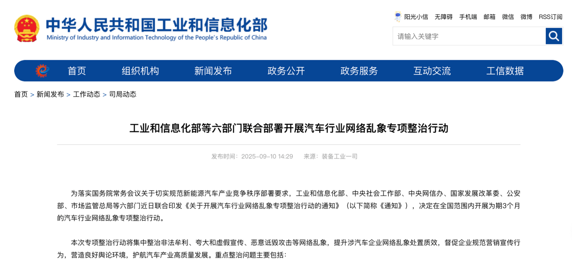 央廣網(wǎng)北京9月10日消息(記者董楠)9月10日,工業(yè)和信息化部(以下簡(jiǎn)稱“工信部”)、中央社會(huì)工作部、中央網(wǎng)信辦、國(guó)家發(fā)展改革委、公安部、市場(chǎng)監(jiān)管總局等六部門聯(lián)合印發(fā)《關(guān)于開展汽車行業(yè)網(wǎng)絡(luò)亂象專項(xiàng)整治行動(dòng)的通知》,決定在全國(guó)范圍內(nèi)開展為期3個(gè)月的汽車行業(yè)網(wǎng)絡(luò)亂象專項(xiàng)整治行動(dòng)。