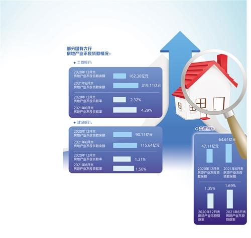 從國有大行已披露數(shù)據(jù)看,截至2021年6月末,中國工商銀行、中國建設(shè)銀行、交通銀行的房地產(chǎn)業(yè)不良貸款余額分別為319.11億元、115.64億元、64.61億元,較去年年末上升156.73億元、25.53億元、17.50億元;房地產(chǎn)業(yè)不良貸款率分別為4.29%、1.56%、1.69%,較去年年末上升1.97個百分點、0.25個百分點、0.34個百分點。