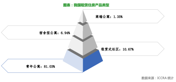 報(bào)告指出,我國(guó)租賃住房類(lèi)型整體呈現(xiàn)出明顯的“正金字塔”形態(tài):滿(mǎn)足年輕人需求的青年公寓占比最大,超過(guò)80%;其次是滿(mǎn)足新市民需求的租賃式社區(qū),占比超過(guò)10%;面對(duì)企業(yè)基層員工的宿舍型公寓占比8.62%;服務(wù)式公寓比例僅為1.35%。