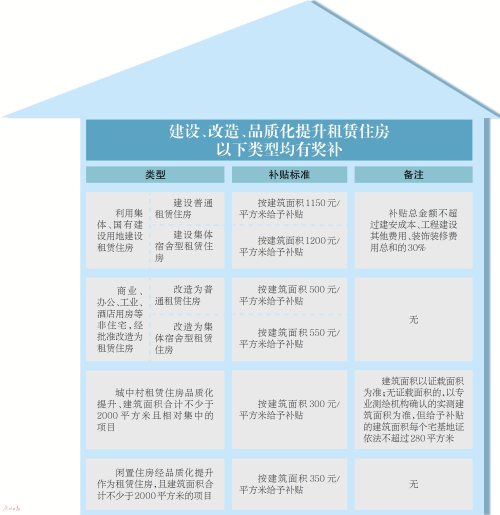 《辦法》提出,為環(huán)衛(wèi)工人、公共交通一線從業(yè)人員等城市重要公共服務(wù)群體提供租賃住房,且租金接受政府指導(dǎo)的,按以下標(biāo)準(zhǔn)給予補(bǔ)貼:新建租賃住房的,按建筑面積1200元/平方米給予補(bǔ)貼;改造租賃住房的,按建筑面積800元/平方米給予補(bǔ)貼;實(shí)施品質(zhì)化提升的租賃住房項(xiàng)目,按建筑面積600元/平方米給予補(bǔ)貼。