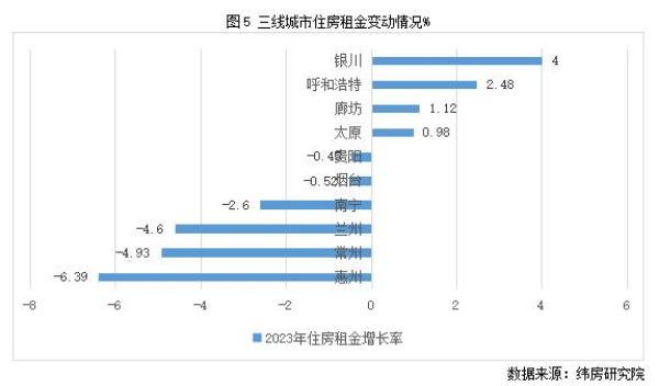 三線城市住房租金漲跌接近參半。住房大數(shù)據(jù)監(jiān)測的重點40城中包括10個三線城市,其中4個城市2023年住房租金小幅上漲,6個城市下降。其中,銀川和呼和浩特漲幅最高,分別為4%和2.48%;惠州、常州和蘭州住房租金跌幅較高,分別為6.39%、4.93%和4.6%。