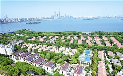 江蘇省蘇州市近年持續(xù)推動(dòng)生態(tài)文明建設(shè),有效改善城區(qū)河湖水質(zhì),構(gòu)建綠色生態(tài)宜居城市。圖為坐落在蘇州市金雞湖畔的居民住宅區(qū)。華雪根攝(人民視覺)