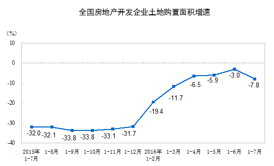 1-7月份,房地產(chǎn)開發(fā)企業(yè)土地購(gòu)置面積11167萬(wàn)平方米,同比下降7.8%,降幅比1-6月份擴(kuò)大4.8個(gè)百分點(diǎn);土地成交價(jià)款3848億元,增長(zhǎng)7.1%,增速回落3.1個(gè)百分點(diǎn)。