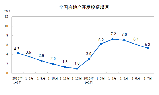 2016年1-7月份,全國(guó)房地產(chǎn)開發(fā)投資55361億元,同比名義增長(zhǎng)5.3%,增速比1-6月份回落0.8個(gè)百分點(diǎn)。其中,住宅投資36981億元,增長(zhǎng)4.5%,增速回落1.1個(gè)百分點(diǎn)。住宅投資占房地產(chǎn)開發(fā)投資的比重為66.8%。