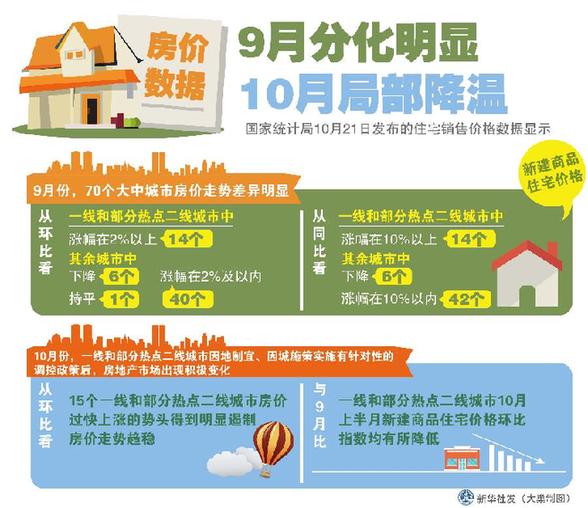 新華社北京10月21日電(記者王希)國(guó)家統(tǒng)計(jì)局21日發(fā)布的住宅銷售價(jià)格數(shù)據(jù)顯示,9月份70個(gè)大中城市房?jī)r(jià)分化明顯,10月份一線和部分熱點(diǎn)二線城市有針對(duì)性地實(shí)施調(diào)控政策,房地產(chǎn)市場(chǎng)明顯降溫。