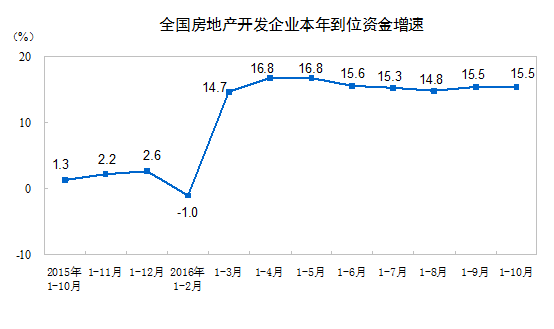 1-10月份,房地產(chǎn)開發(fā)企業(yè)到位資金117261億元,同比增長15.5%,增速與1-9月份持平。其中,國內(nèi)貸款17303億元,增長1.2%;利用外資123億元,下降49.0%;自籌資金40764億元,增長0.6%;其他資金59071億元,增長35.2%。在其他資金中,定金及預(yù)收款33655億元,增長32.2%;個(gè)人按揭貸款19783億元,增長51.5%。