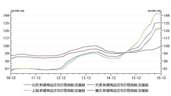 重慶近兩年的房?jī)r(jià)漲幅明顯低于另外3個(gè)直轄市。數(shù)據(jù)來源:Wind資訊