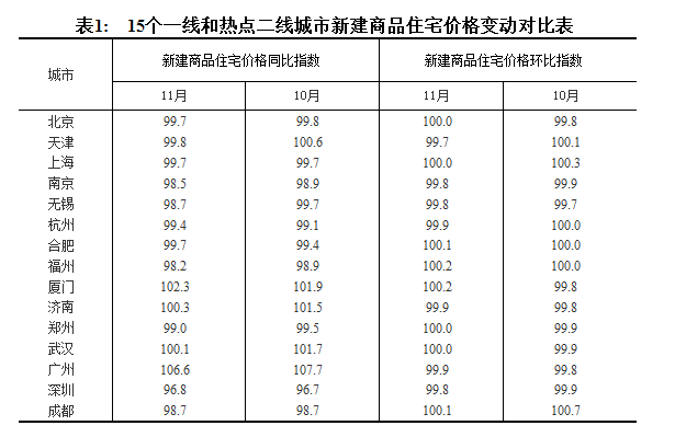 11月份,70個大中城市中15個熱點城市房地產(chǎn)市場總體繼續(xù)保持平穩(wěn)。從環(huán)比看,7個城市新建商品住宅價格下降,降幅在0.1%至0.3%之間;北京、上海、鄭州和武漢4個城市環(huán)比持平。