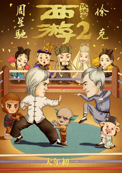 12月28日,由周星馳與徐克聯(lián)手打造,吳亦凡、林更新、姚晨、林允、包貝爾、巴特爾、楊一威、大鵬、王麗坤、汪鐸、張美娥主演的電影《西游伏妖篇》曝光“打斗版”預(yù)告片,以及周星馳與徐克兩位導(dǎo)演“對(duì)壘”上陣的漫畫版海報(bào)。“打斗版”預(yù)告片中,師徒四人一路既有互打,也有互“逗”,吳亦凡飾演的唐僧與林更新飾演的孫悟空貼身而睡,“動(dòng)手動(dòng)腳”讓孫悟空極為不滿,聲稱要干掉唐僧,卻慘遭唐僧的一頓揮鞭暴打。此外,周星馳與徐克繼先導(dǎo)預(yù)告之后,再次奉獻(xiàn)神演技續(xù)寫彩蛋:預(yù)告片中的孫悟空首次以猴子造型出現(xiàn),讓周星馳欣喜不已,大贊徐克特效出彩,卻慘遭徐克導(dǎo)演潑冷水:“那就是真猴子?。 彪娪啊段饔畏穼⒂?017年1月28日大年初一全國(guó)上映。