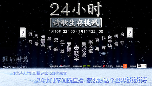 據(jù)了解,從1月10日晚22:00開始,秦導(dǎo)邀請了24位各界知名人士,24小時不間斷直播接力談詩歌。自媒體“羅輯思維”創(chuàng)始人羅振宇,著名財經(jīng)作家、財經(jīng)自媒體“吳曉波頻道”創(chuàng)始人吳曉波,國際著名詩人楊煉,香港著名文化人梁文道,湖南衛(wèi)視著名主持人汪涵,自媒體人袁岳,著名知識分子余世存,詩人余秀華,詩人、詩歌自媒體“讀首詩再睡覺”公號主編流馬,編劇史航,金馬獎最佳紀(jì)錄片導(dǎo)演周浩,歐洲著名漢學(xué)家柯雷,著名音樂人黑楠等人,將通過現(xiàn)場、電話連線、視頻等多種方式參與本次在線直播活動,而鳳凰衛(wèi)視著名主持人曹景行、著名主持人崔永元以及詩歌評論家唐曉渡也有望一起參與。
