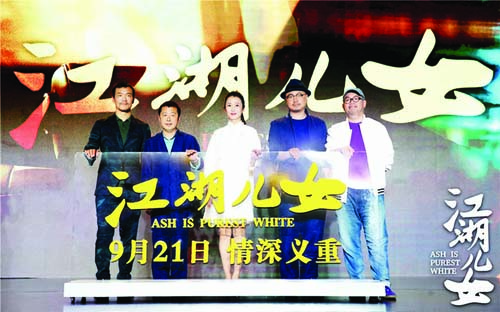 《江湖兒女》由上影集團、北京西河星匯、歡喜傳媒、法國MK2、北京潤錦投資、無限自在傳媒及歌童映畫聯(lián)合出品,片方在當天發(fā)布會上公布了定檔預告片和兩款定檔海報,伴隨著緊湊的節(jié)奏,“咱們是哪種人?”“江湖上的人?!眱删鋽S地有聲的臺詞將人拉入這場江湖風暴,金錢、暴力、兒女情長隨之展開;海報則一款整體色調(diào)偏暗,風雨欲來,另一款則色調(diào)明亮,情深意切,雖然色調(diào)、構(gòu)圖和氛圍各不相同,但巧巧與斌哥愛情故事中的狂風暴雨與江湖氣盛兒女情長同樣呼之欲出,動人心魄。