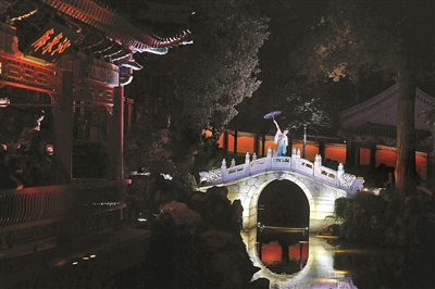 靜心齋與昆曲有著深厚的歷史淵源。明清時(shí)期,昆曲演出就已納入宮廷文化的范疇。在靜心齋西跨院潺潺的流水聲和光影變幻中,游客還將邂逅昆曲《牡丹亭》中最引人入勝的經(jīng)典選段《游園驚夢(mèng)》。亭臺(tái)樓閣,假山疊石,美輪美奐,妙不可言。繼續(xù)往里走,在小玉帶橋上,舞者持傘翩然而舞,以傘遮面,時(shí)而高舉傘,時(shí)而開合傘,《雨碎江南》舞蹈讓人看得陶醉。