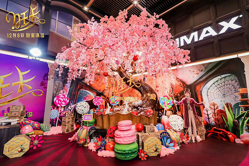 首映現(xiàn)場,最引人注目的當屬電影里標志性的巧克力櫻花樹。片中,旺卡在粉色櫻花樹下漫灑巧克力糖果,夢幻爛漫,猶如童話仙境。而在首映禮現(xiàn)場,這棵櫻花樹也被完美復(fù)刻,櫻花樹四周堆滿各色巧克力糖果和花朵,令觀眾可以親身走入巧克力“花?!保蔀楫斕斓拇蚩c。