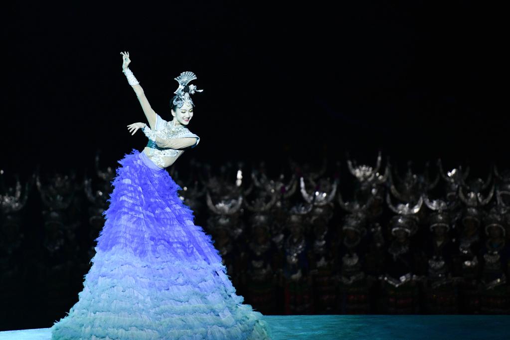 9月20日晚,演員在貴州省雷山縣大塘鎮(zhèn)表演苗族歌舞詩(shī)劇《仰歐?!?。新華社記者 楊文斌 攝