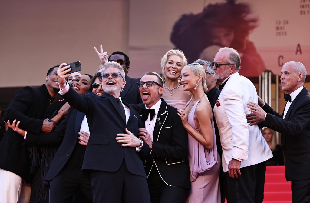 5月14日,在法國戛納舉行的第78屆戛納國際電影節(jié)上,美國導演克里斯托夫·邁考利(左五)等《碟中諜8:最終清算》主創(chuàng)人員在首映禮上自拍。新華社記者 高靜 攝