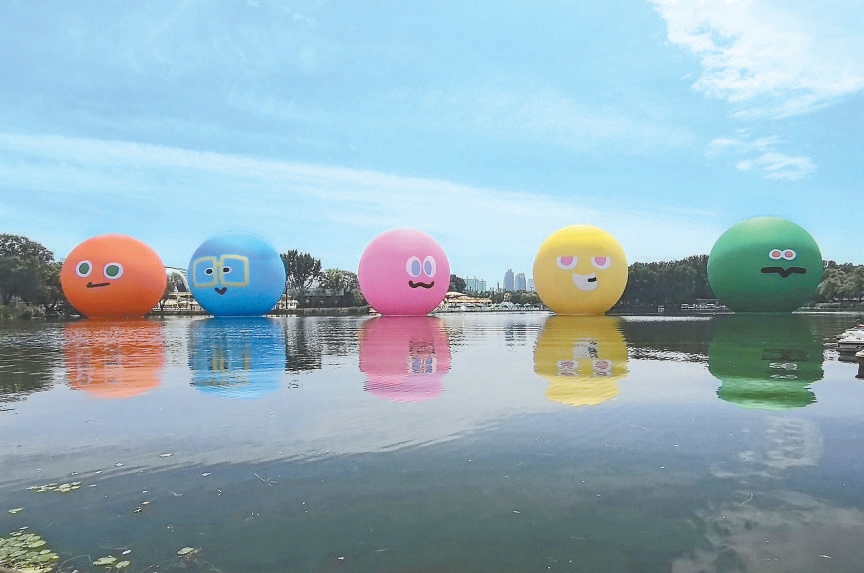 近日,朝陽公園北碼頭附近的湖面上新添五個(gè)10米高的充氣大球,粉色、黃色、綠色等不同顏色,對應(yīng)的是樂隊(duì)組合五月天的不同成員,也與今年7月25日至8月9日,五月天在鳥巢舉辦演唱會(huì)的舞臺(tái)裝置遙相呼應(yīng)。與此同時(shí),樂隊(duì)成員的人物公仔也分別放置在居庸關(guān)長城、首鋼園、鼓樓廣場、798·751藝術(shù)區(qū)、亮馬河畔等地標(biāo)景點(diǎn)。