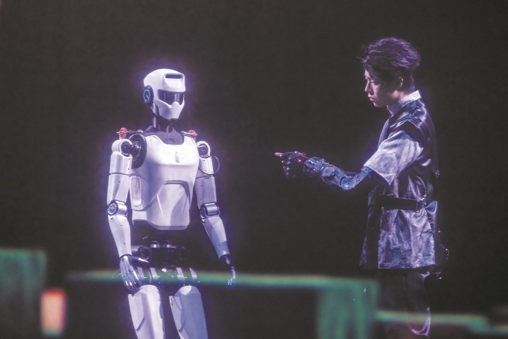 這是發(fā)生在中國(guó)大戲院長(zhǎng)三角城市戲劇節(jié)中的最“科幻”一幕,國(guó)內(nèi)領(lǐng)先的機(jī)器人走出實(shí)驗(yàn)室和展廳,以接地氣、親和的方式來到普通人身邊。面對(duì)這樣的場(chǎng)景,人們不再那么陌生——2025春晚上,張藝謀導(dǎo)演的《秧BOT》讓人形機(jī)器人略顯滑稽地扭起秧歌;上半年,半程馬拉松也迎來人形機(jī)器人“跌跌撞撞”的身影?!拔覀?cè)谔剿饕环N可能性,試著模擬發(fā)生在未來的場(chǎng)景?!薄毒尬镏恰匪囆g(shù)總監(jiān)、上海戲劇學(xué)院藝術(shù)科技與管理學(xué)院副院長(zhǎng)沈倩對(duì)記者說,“無論對(duì)于機(jī)器人還是演藝產(chǎn)業(yè)來說,都具有破圈的意義?!闭\(chéng)然,機(jī)器人仍在亦步亦趨地努力跟上人類的節(jié)奏,但其不斷前進(jìn)的腳步已經(jīng)令人激動(dòng)。面對(duì)“人機(jī)共生”的時(shí)代命題,上海邁出了全國(guó)舞臺(tái)實(shí)踐的第一步。