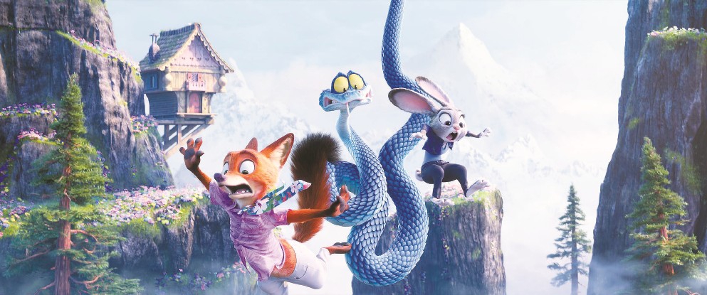 不過《瘋狂動(dòng)物城2》的“奔跑”意涵并不會(huì)上升到《羅拉快跑》的哲思層面。動(dòng)物們的一路狂奔自然也是為了成就影片的“好看”。從冰山雪川到熱帶雨林,從沙漠風(fēng)生到沼澤水起,汽車追逐要的是光怪陸離的街景,水里逃生要的是窒息壓迫的氛圍,冰雪對(duì)決要的是蒼茫一片的天地。觀眾們的視線跟隨著動(dòng)物角色的行動(dòng)高速地移轉(zhuǎn),從一個(gè)驚奇進(jìn)入下一個(gè)驚奇,從一處景觀轉(zhuǎn)入下一個(gè)景觀,這種步移景換的觀看,與他們?cè)诘鲜磕嵊螛穲@里進(jìn)行沉浸式大型項(xiàng)目的體驗(yàn)非常相似。只不過,目迷五色的“眩暈”體驗(yàn)從5分鐘延長(zhǎng)到了100分鐘。未來的一個(gè)市場(chǎng)可能大概是,人們會(huì)有機(jī)會(huì)在某處的迪士尼樂園項(xiàng)目中重溫熟悉而親切的瘋狂動(dòng)物城記憶。