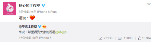 中新網(wǎng)5月20日電今日,霍建華工作室官方微博發(fā)布一條消息,稱“華說:希望得到大家的祝福?!辈亓肆中娜纭kS后,林心如工作室官方微博轉(zhuǎn)發(fā)微博,發(fā)表紅心默認(rèn)。