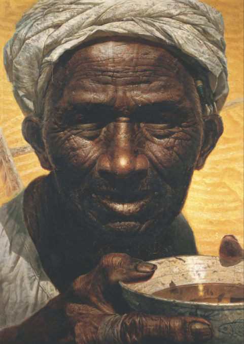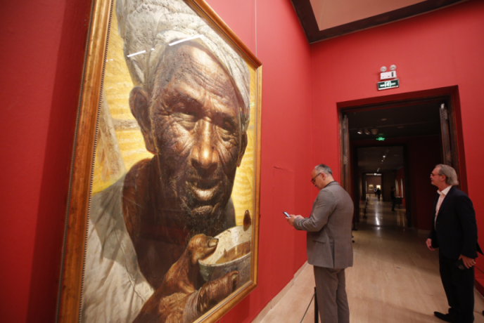 烈日下的一位老農(nóng),在勞動的間隙手捧粗瓷碗準(zhǔn)備喝水,大顆晶瑩的汗水流過他臉上深深的溝壑。展覽展出的羅中立油畫《父親》以紀(jì)念碑式的宏偉構(gòu)圖、超寫實的手法,飽含深情地刻畫出中國農(nóng)民的典型形象。1980年,羅中立以《父親》震撼中國畫壇,并獲第二屆全國青年美展一等獎。數(shù)十年來,這張臉龐深深打動了無數(shù)中國人的心,成為改革開放以來中國現(xiàn)實主義藝術(shù)創(chuàng)作的一道豐碑。