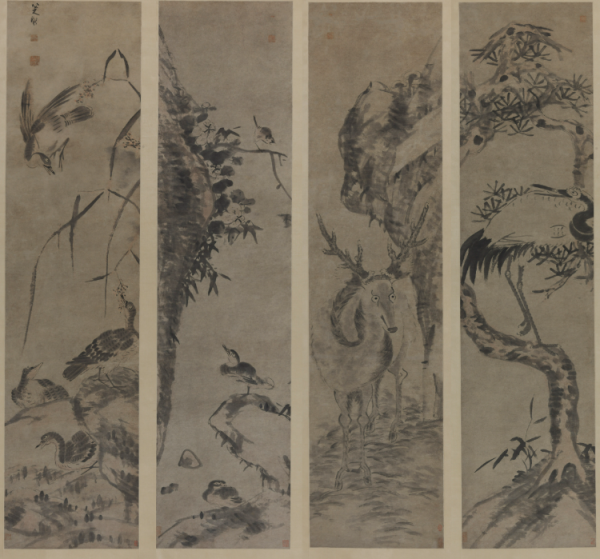 八大山人朱耷創(chuàng)作《鶴鹿鳧雁圖》每軸獨立成像,分別描繪了鶴、鹿、鳧、雁。從署款“八”呈兩點,并改“畫”為“寫”來看,應(yīng)是其70歲之后的佳作。屏中每個形象均作“白眼”狀,彼此間還似乎相互顧盼。白眼是一種孤高、孤傲的自我表達(dá)。但八大山人對世事的孤冷與不屑,也建立在他對世界充滿童真和天趣的藝術(shù)人文溫度。歷經(jīng)人生坎坷的他最后歸于平和,既嚴(yán)肅、又幽默地表達(dá)自己的情感。