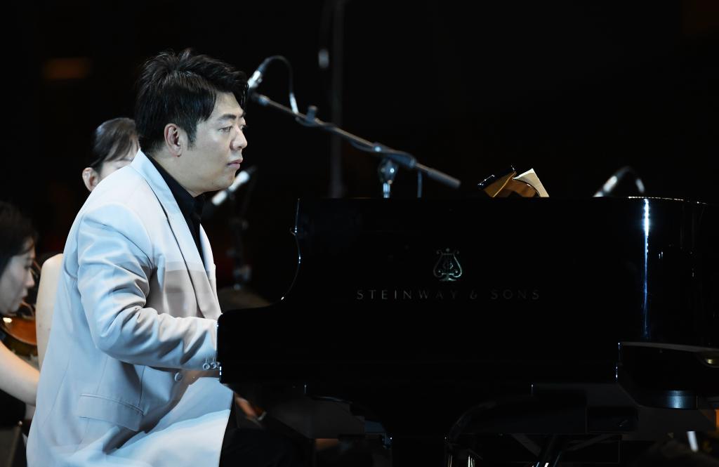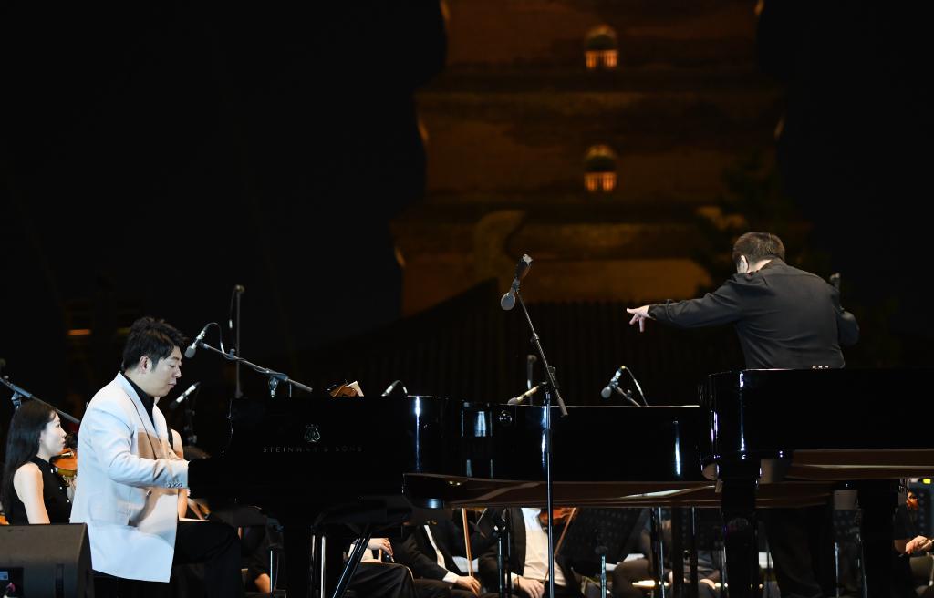 9月10日晚,鋼琴家郎朗與西安交響樂團在西安大雁塔北廣場戶外公演。新華社記者 李一博 攝