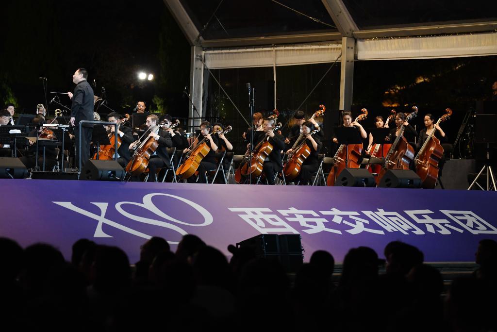 9月10日晚,西安交響樂團在西安大雁塔北廣場戶外公演。新華社記者 李一博 攝