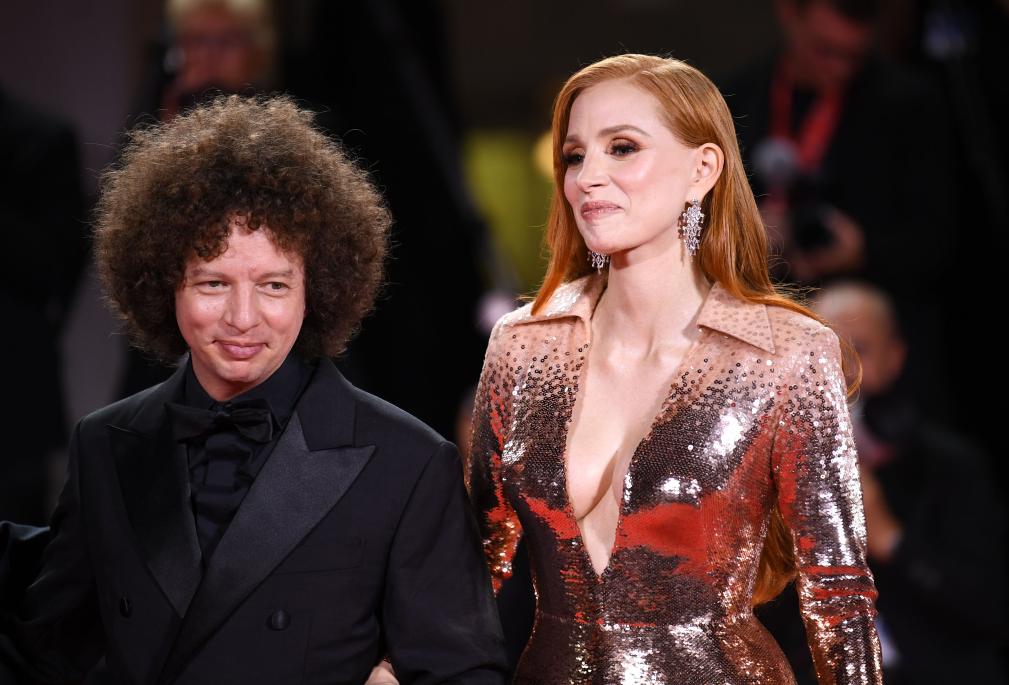 9月8日,在意大利威尼斯,電影《記憶》導(dǎo)演米歇爾·佛朗哥(左)和演員杰西卡·查斯坦亮相首映式紅毯。新華社記者 金馬夢妮 攝