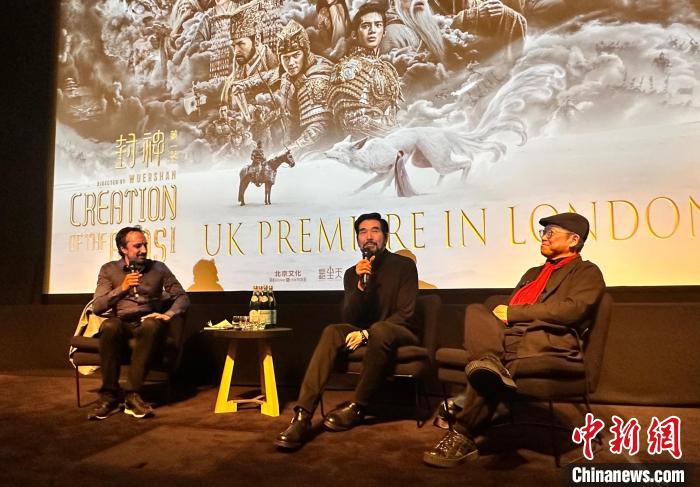 9月17日,中國電影《封神》(第一部:朝歌風(fēng)云)在倫敦舉辦英國首映禮,演員費(fèi)翔(中)、美術(shù)指導(dǎo)葉錦添(右)在首映禮上分享創(chuàng)作故事。 中新社記者 歐陽開宇 攝