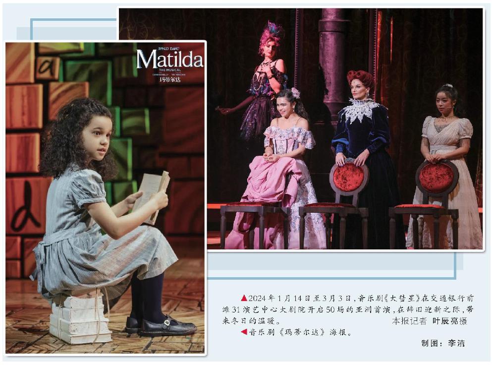 2024年1月14日至3月3日,音樂劇《大彗星》在交通銀行前灘31演藝中心大劇院開啟50場的亞洲首演,在辭舊迎新之際,帶來冬日的溫暖。 本報記者 葉辰亮攝 音樂劇《瑪?shù)贍栠_》海報。