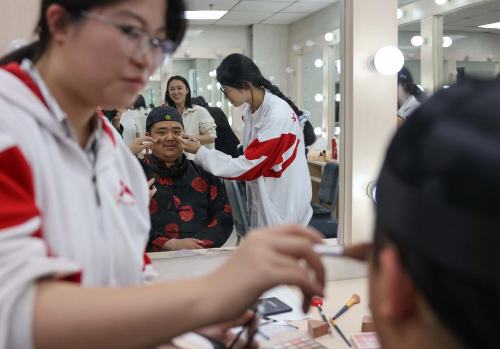 5月11日,中國(guó)人民大學(xué)附屬中學(xué)分校的學(xué)生在演出前化妝。新華社記者 殷剛 攝