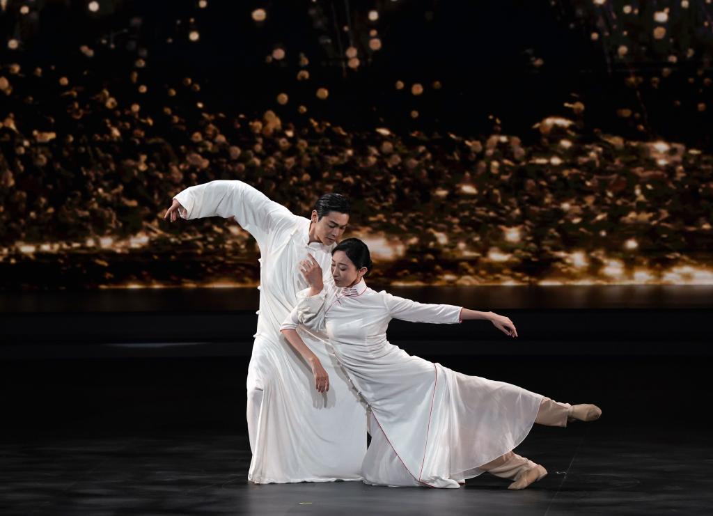 6月15日,第26屆上海國(guó)際電影節(jié)開(kāi)幕影片、舞劇電影《永不消逝的電波》的演員朱潔靜(右)、王佳俊在金爵盛典上表演。新華社記者劉穎 攝