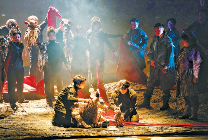 在舞臺(tái)呈現(xiàn)上,舞美設(shè)計(jì)常煒以“山的血脈”為核心意象,山體內(nèi)部的紋理宛若血液流動(dòng),山石土地俱在跳動(dòng)、呼吸。整體來(lái)說(shuō),《可可西里》的舞臺(tái)置景變化并不劇烈,燈光、景片以及經(jīng)幡等裝飾以恰到好處的力度表明時(shí)間地點(diǎn)的轉(zhuǎn)換,暗喻劇情和人物內(nèi)心的走向——在有些舞臺(tái)作品選擇以噱頭和炫技招攬觀眾的當(dāng)下,《可可西里》流淌著一種久違的、質(zhì)樸的暖意,主創(chuàng)團(tuán)隊(duì)為這部作品付出了足夠的誠(chéng)意,比如,無(wú)論是電影《可可西里》,還是人們對(duì)這片凈土的既有認(rèn)知,動(dòng)物都在其中扮演重要的角色,但毫無(wú)疑問(wèn),要在舞臺(tái)上把動(dòng)物塑造得真實(shí)且有藝術(shù)表現(xiàn)力,并不容易。主創(chuàng)團(tuán)隊(duì)沒(méi)有偷工減料地繞過(guò)這個(gè)難題,而是以模仿動(dòng)物習(xí)性的“偶”代替,當(dāng)從“母羊”的腹中剖開(kāi)一卷鮮紅的長(zhǎng)綢,“小羊”跌跌撞撞地學(xué)著起身時(shí),溫柔灑落的天光配合層層遞進(jìn)的音樂(lè),把現(xiàn)場(chǎng)氣氛推向一次動(dòng)人的高潮。