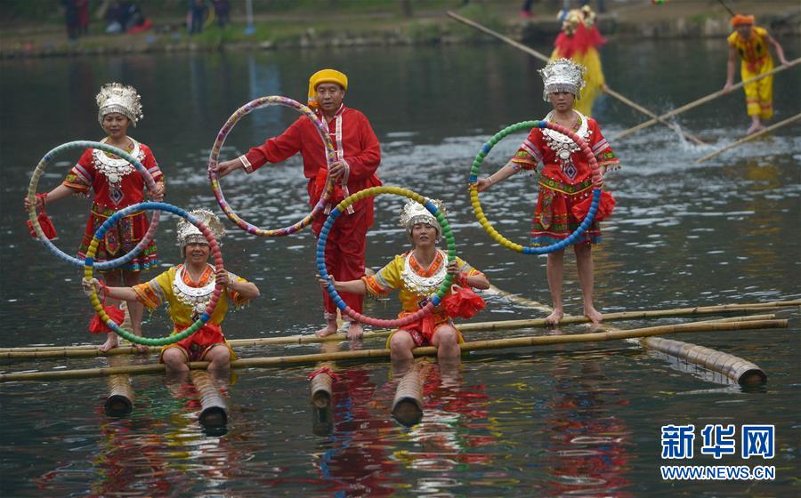 1月1日,“獨(dú)竹漂”愛好者在花溪河上表演水上高難度平衡動作。 2016年元旦,在貴陽市花溪公園平橋河段舉行的貴陽市第31屆冬泳表演活動中,數(shù)十名“獨(dú)竹漂”愛好者在花溪河上腳踏漂浮的竹竿,表演“金雞獨(dú)立”、轉(zhuǎn)身平衡等高難度動作,讓觀眾大飽眼福。新華社發(fā)(秦剛 攝)
