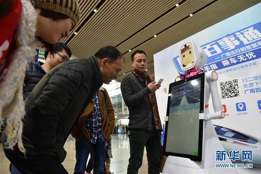 2月1日,旅客們在廣州南站與智能機器人“小璐”對話。當日,一臺名叫“小璐”的智能機器人亮相廣州南站,吸引了大批旅客的圍觀,大家紛紛嘗試與“小璐”對話,向她咨詢列車時刻、購票信息、天氣情況等問題,“小璐”不僅可以用甜美的女聲一一作答,還可以在接收到語音指令后,為旅客“唱歌”和“跳舞”。據(jù)了解,使用智能機器人服務(wù)旅客是廣州南站在今年春運中的新嘗試,如果試用效果良好,今后有望在車站中看到更多智能機器人的身影。新華社記者 梁旭 攝